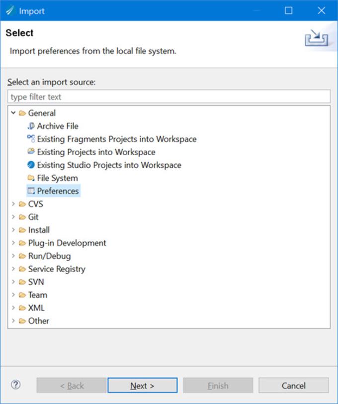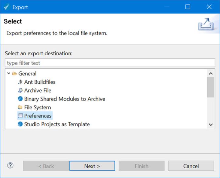 You can also import the Studio or Eclipse preferences set in the other user's workspace and export the Studio or Eclipse preferences set in your workspace. These preferences are stored in a file with an extension .epf. You can select any preferences that you want to import or export.