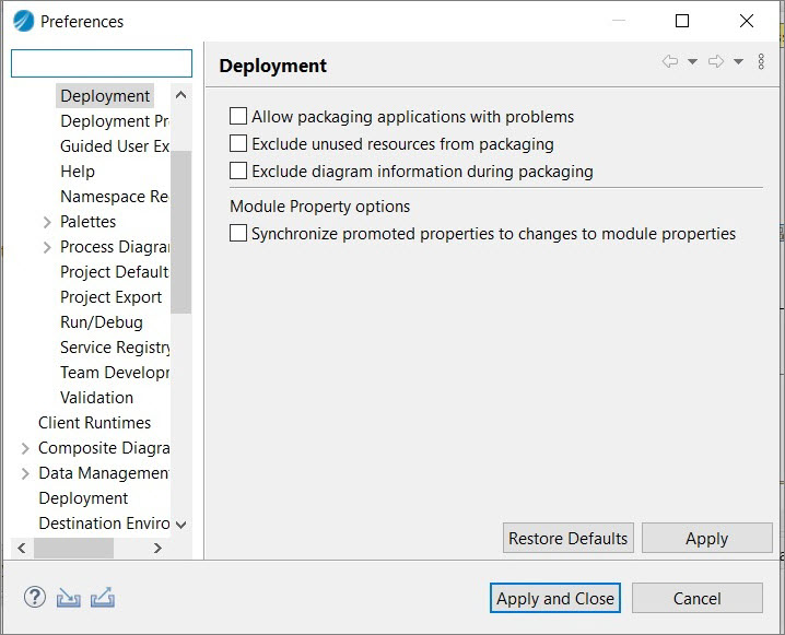 - Expand BusinessWorks and select Deployment. Select or clear the checkboxes to set the preferences as required, click Apply and Close.