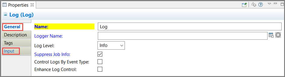 In the above example, only the General and Input tabs are highlighted, since the properties displayed on these tabs are changed.