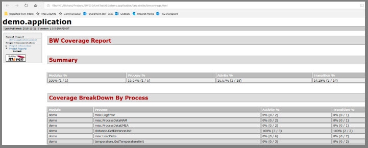 The "site" goal that is included in the Maven debug configuration in TIBCO Business Studio for BusinessWorks and on the command line produces unit test reports and test coverage reports. These test reports are located at \demo.application\target\site.
