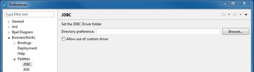 In TIBCO Business Studio for BusinessWorks, you can enable the JDBC palette to use custom drivers. Before you do this, ensure that you place the drivers in TIBCO_HOME/bwce/version/config/design/thirdparty.