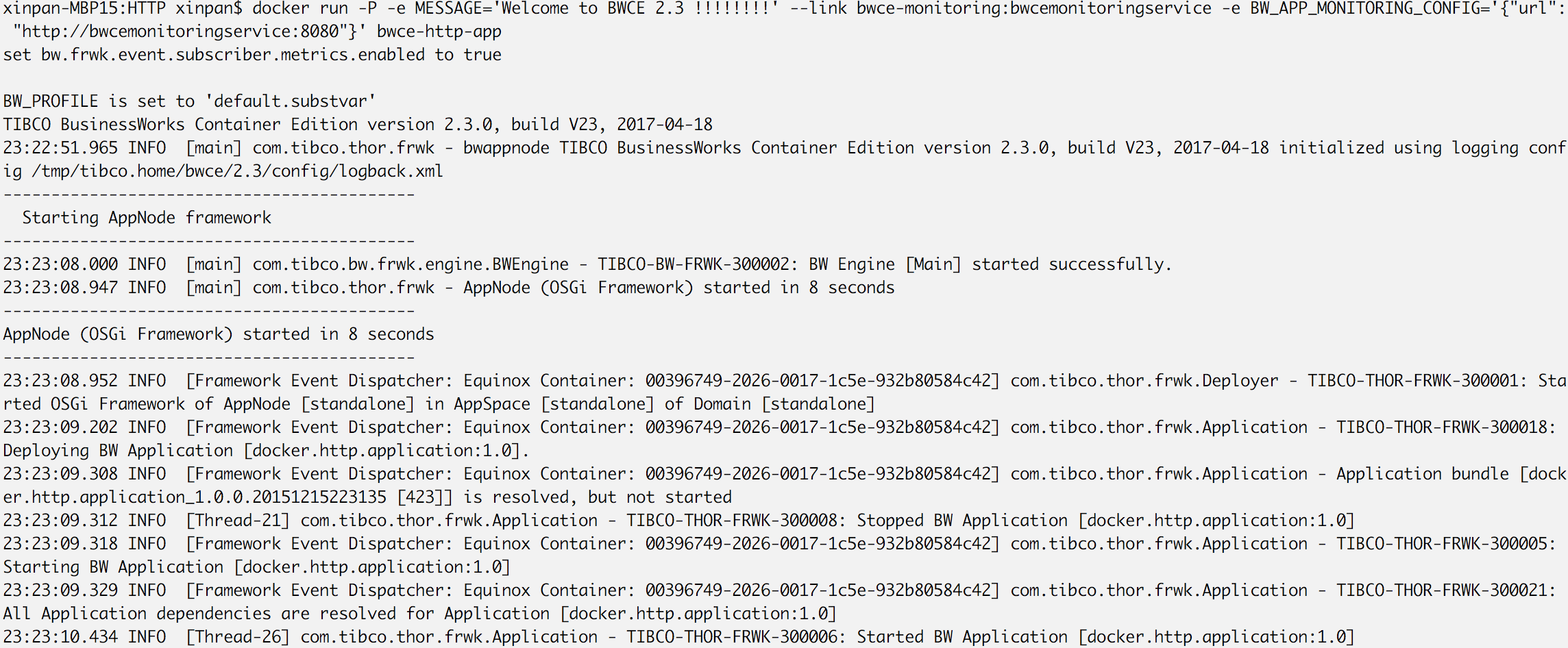 docker build -t <application name> . - In docker run command, set an environment variable BW_APP_MONITORING_CONFIG to enable monitoring