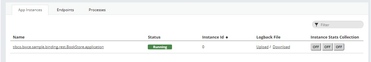 - To view app instances of an application, click App Instances tab. You can also upload and download the logback file from the App Instances tab.