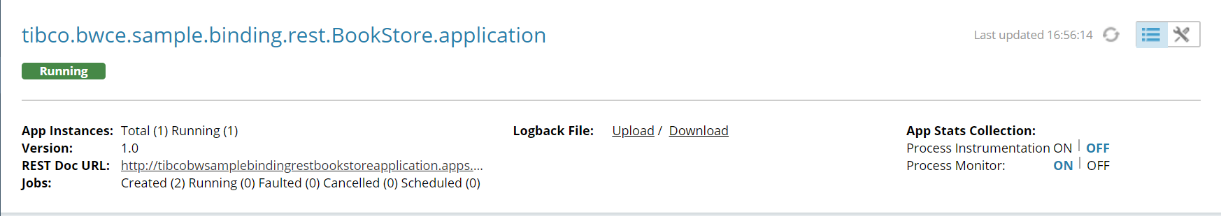 http://<External URL>/swagger.Number of created jobs, running jobs, faulted jobs, cancelled jobs and scheduled jobs.To upload or download a logback file click the Upload or Download link, from the monitoring dashboard. - On the Applications page, select the running application you want to view.