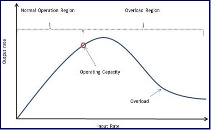 Beyond the operating capacity, further increase in the input rate exceeds the capacity of the system to perform work. Once this occurs, increasing the input rate does not produce the same level of increase in the output. The inputs are increasing faster than the system is producing output. If the input rate continues to increase it reaches a point where the output rate begins to decline. The system is taking resources away from completing work and applying them to accepting the inputs.