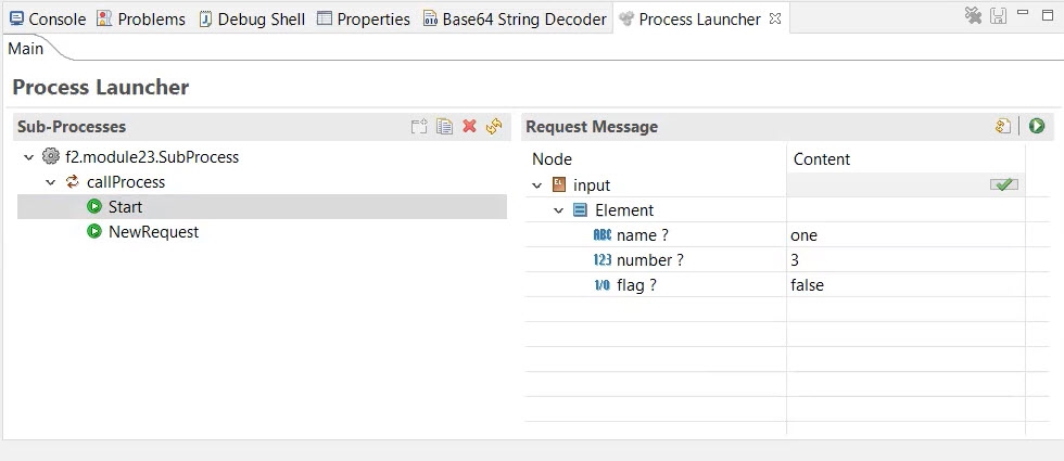 Using the process launcher feature, you can see and test the subprocesses, which can accept the input. The input to the process instance is provided through the process launcher to test the subprocess individually.