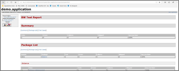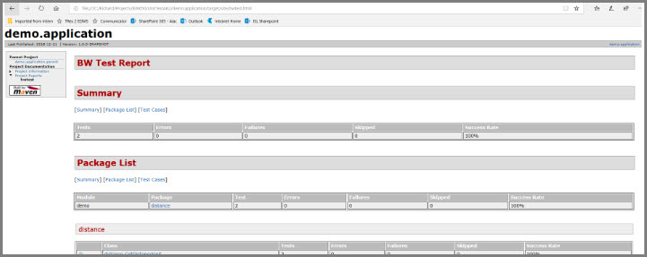 The "site" goal that is included in the Maven debug configuration in TIBCO Business Studio for BusinessWorks and on the command line produces unit test reports and test coverage reports. These test reports are located at \demo.application\target\site.