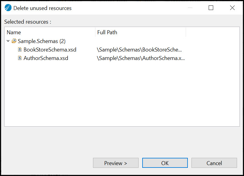 It shows the list of selected resources. To see the list of corresponding dependencies, click Preview button. To delete dependent resources, click Ok.