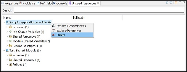 When you try to delete an unused artifact which has dependencies as well as references on the other unused artifacts, a new Delete unused resources dialog box opens.