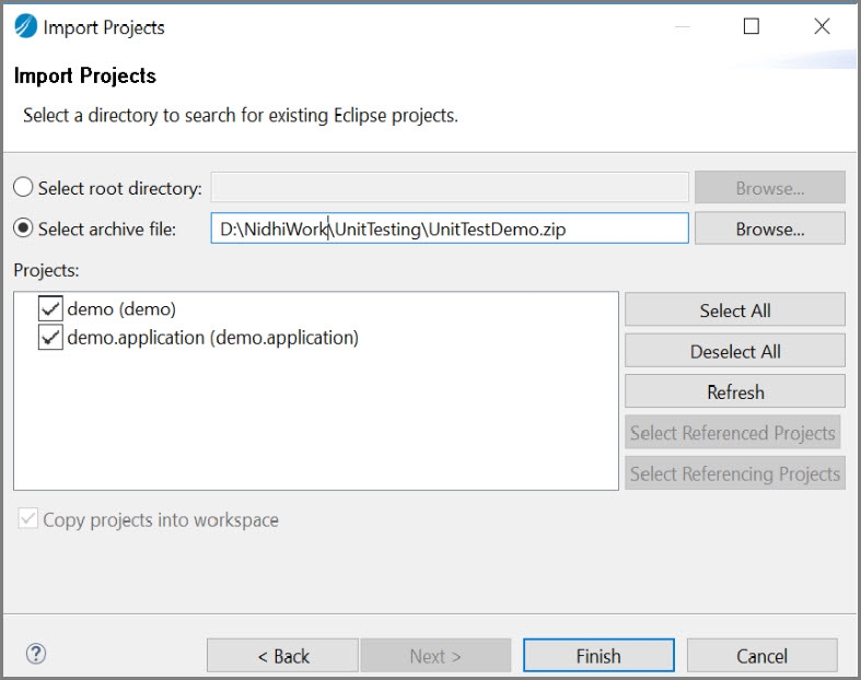 - Click the browse button next to the Select archive file: option to import the projects in a .zip file or copy paste the path of the required .zip file in the Select archive file: input field and click Finish.