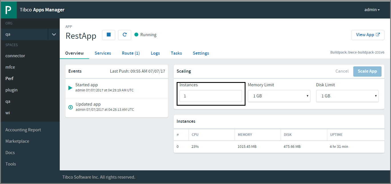Horizontal scaling can be achieved through the cf cli as well as with cloud foundry UI. Use cf scale APP -i INSTANCES to horizontally scale your application. Cloud Foundry will increase or decrease the number of instances of your application to match INSTANCES. Below snapshot shows the horizontal scaling through the cloud foundry UI.