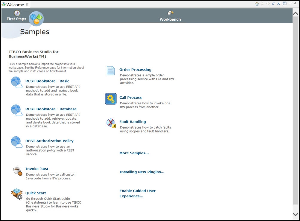 The File Explorer view displays a top level listing of all the samples.Note: If the workspace is from an older version, you need to locate the samples manually using the Open Directory to Browse button available on the File Explorer view. TIBCO Business Studio for BusinessWorks stores the samples at tibco-home/bwce/2.5/samples.