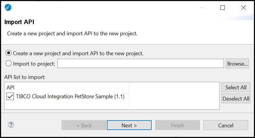 Option Description Import to project Select the radio button to import the API into an existing project and browse to the project using the Browse button. Create a new project and import API to the new project To create a new project and import the API into that project select the radio button. API list to import Select the API or the appropriate version of the API when there are multiple versions of the API available. - Create a new application module with appropriate details and click