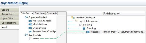 • Mapping the output from previous activities to the current activity's input. Using the mapper, you can choose functions or constants from the Functions and Constants tabs with the mapped data.