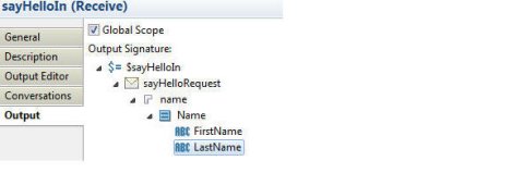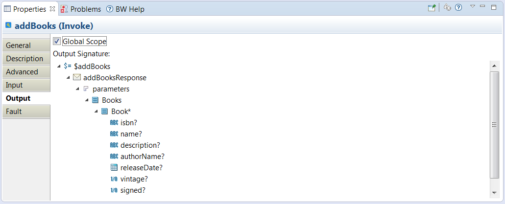 The Output tab is available in the Properties view and is used to display the activity output schema. The output of an activity is displayed for informational purposes only and cannot be modified or altered.