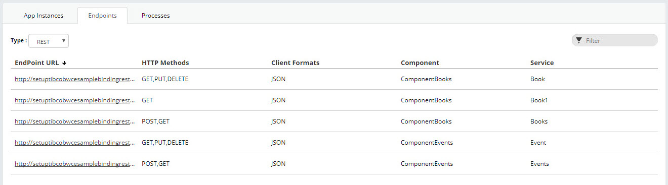 - Click the Endpoints tab to view endpoints exposed by the application. The type of endpoint is displayed at the top of the tab.