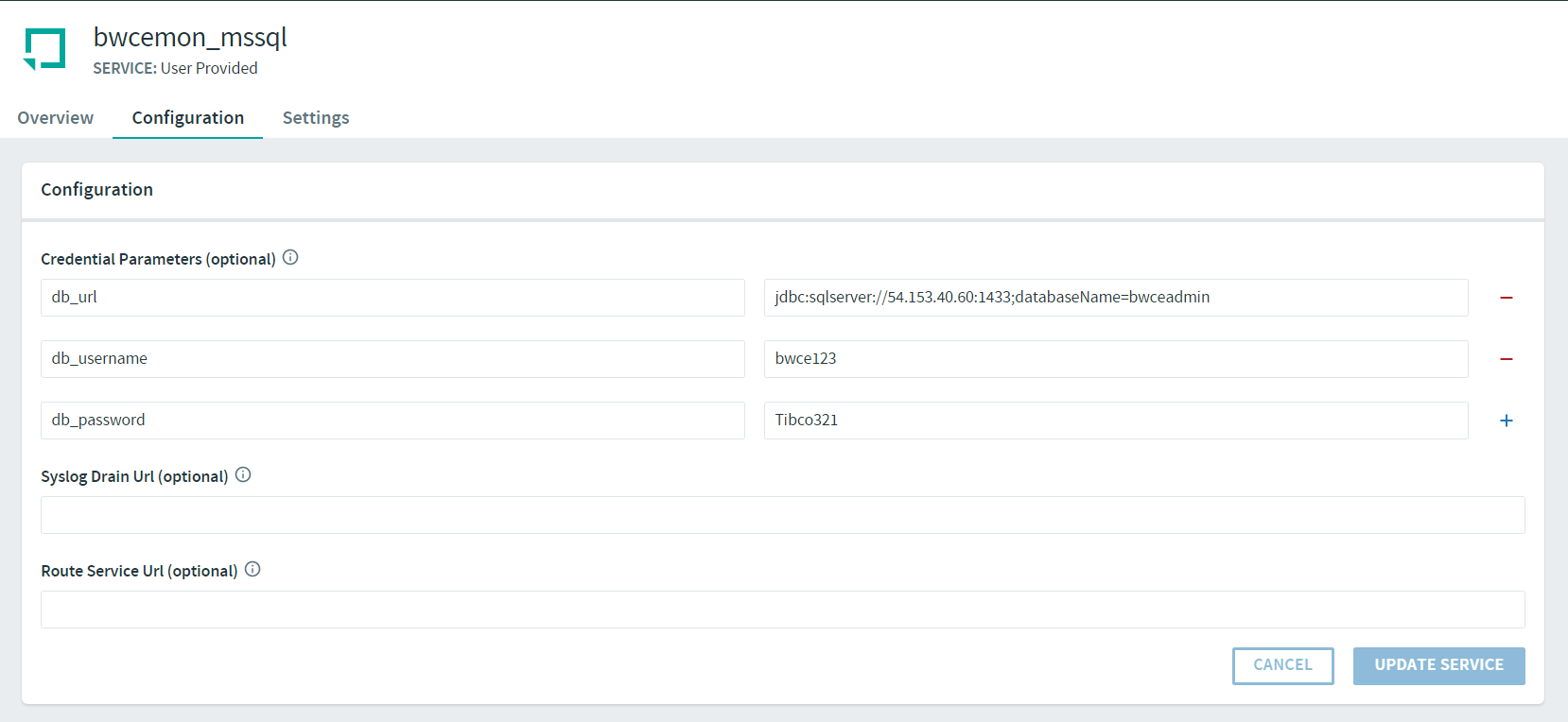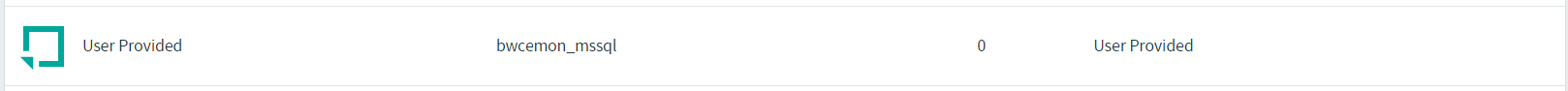Note: Define the <SERVICE_INSTANCE_NAME> asbwcemon_mssql.MS SQL is now configured with the user provided service on the Cloud Foundry environment.