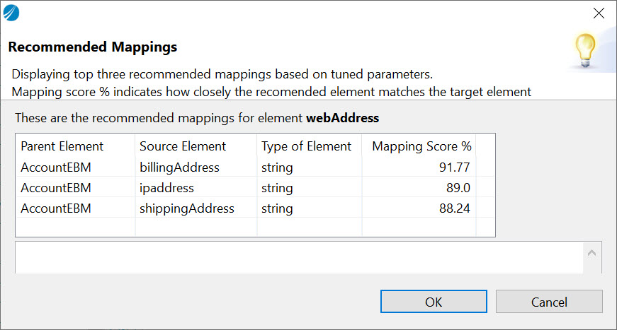 - Mapping Score % - The rating of the recommended source element to the selected target element