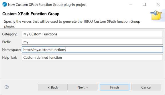 • Category: The name of the category that includes the custom XPath functions • Prefix: The prefix for the functions • Namespace: The namespace for the functions • Help Text: The description of the functions -