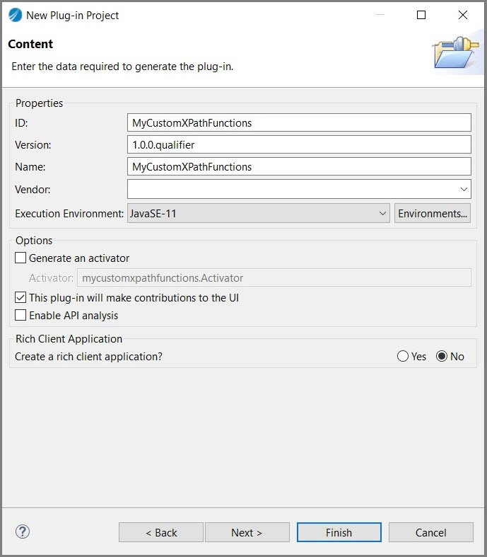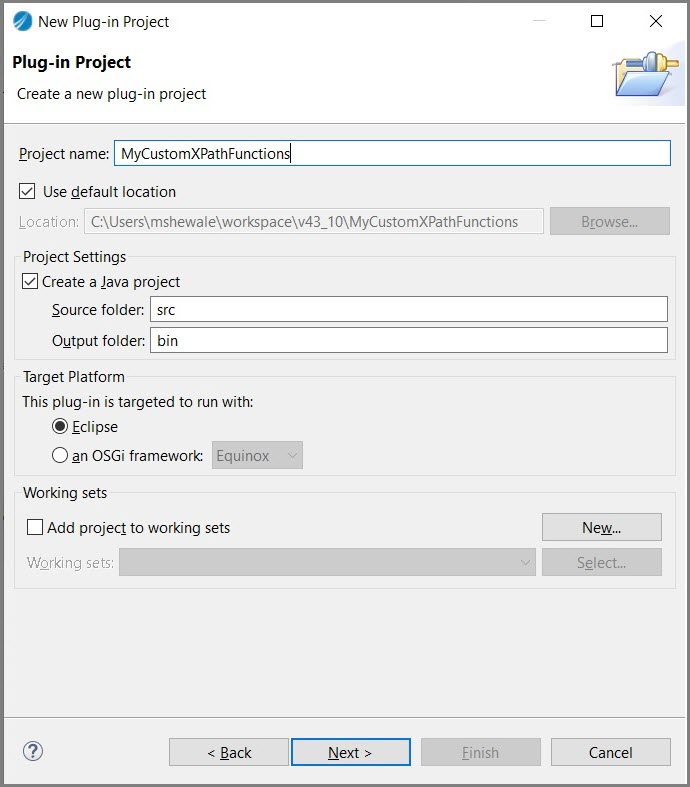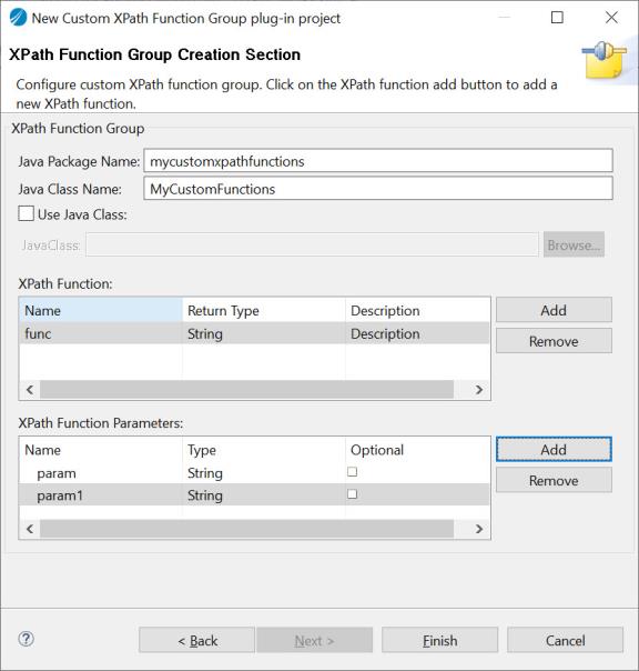 In the New Custom XPath Function Group plug-in project window, provide values for the following fields and click Next to continue.