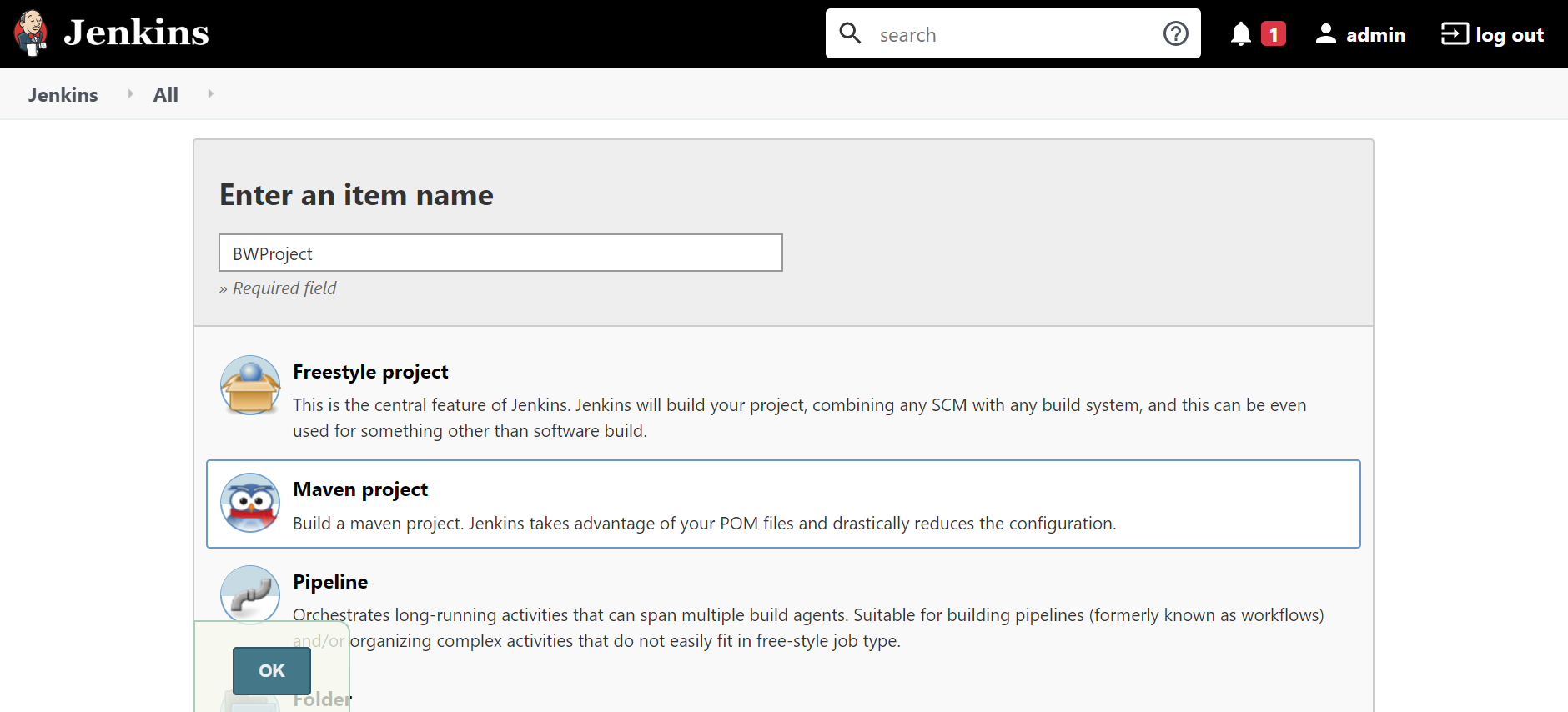 - On the Jenkins Dashboard, click New Item and add a name for the Maven Project, for example