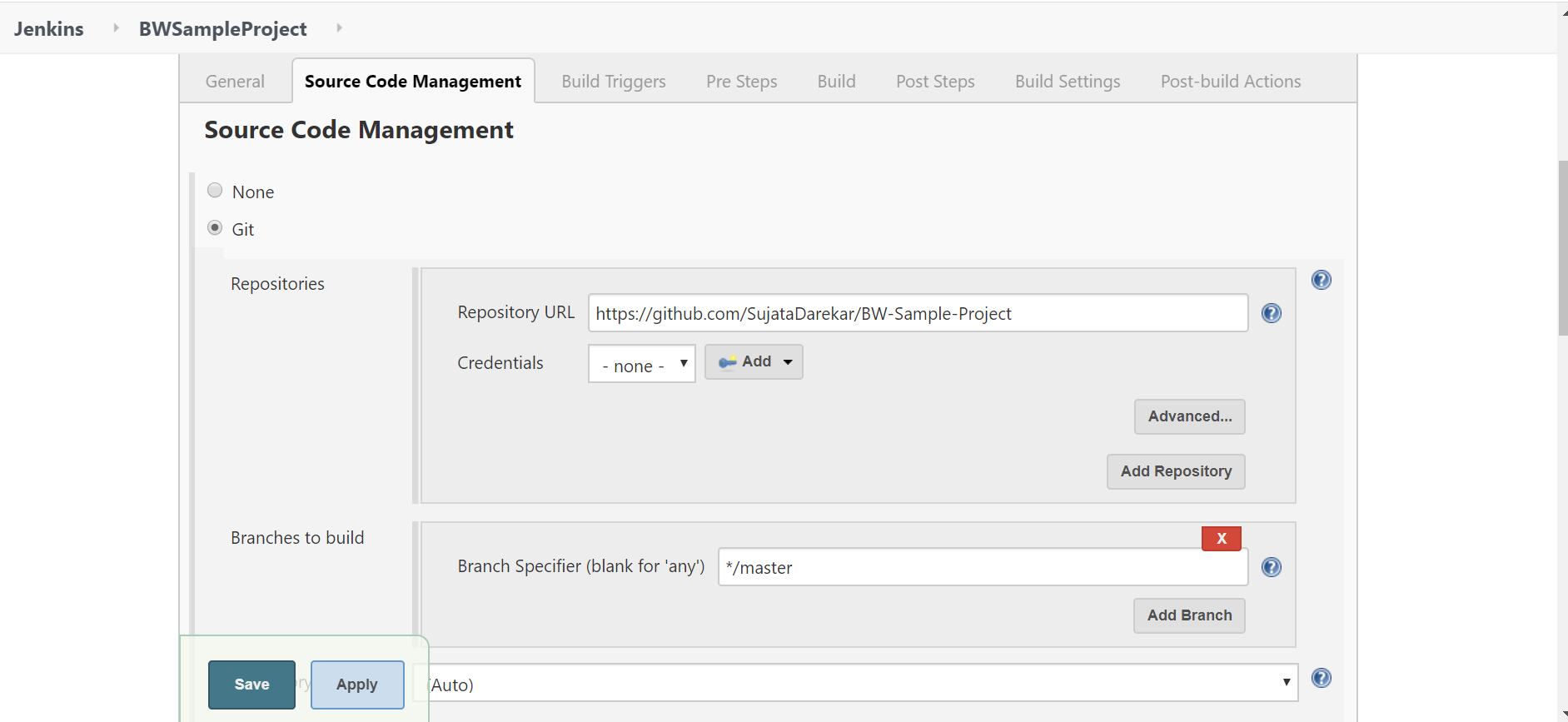 On the Source Code Management tab, select Git and add the GitHub repository URL where the project is present.