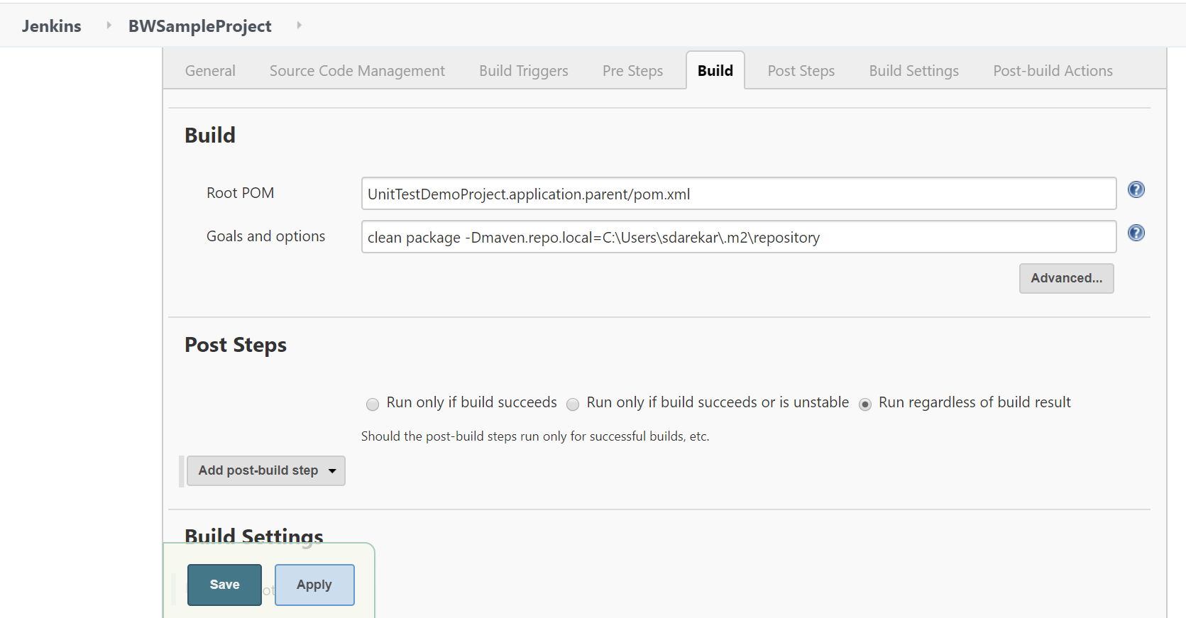 -Dmaven.repo.local=C:\Users$username.m2\repositoryso that Jenkins can refer to auser local .m2repository where all the dependencies are present.