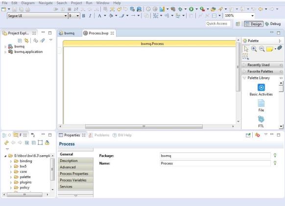 ResultA project and an application are created and displayed in the Project Explorer view. The Process editor is displayed automatically.