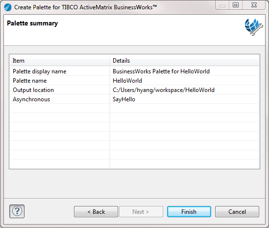 - In the Palette summary dialog, review the palette information and click Finish to generate the code for the HelloWorld palette and the SayHello activity.