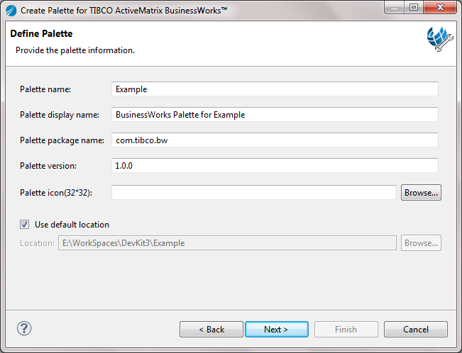 is used as the palette icon. The supported image formats are .jpg, .gif, .png, and .jpeg. The size of the icon must be 32x32 or larger. BusinessWorks Plug-in Development Kit automatically generates the icon in size of 16x16 and 32x32.