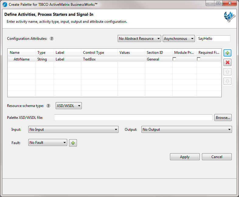 - If you select None, no input and output are generated. BusinessWorks Plug-in Development Kit generates default schema for fault.