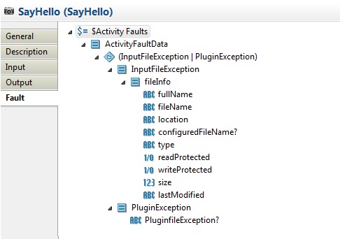 After generating the activity, click the Input, Output, and Fault tabs accordingly to check the schema: