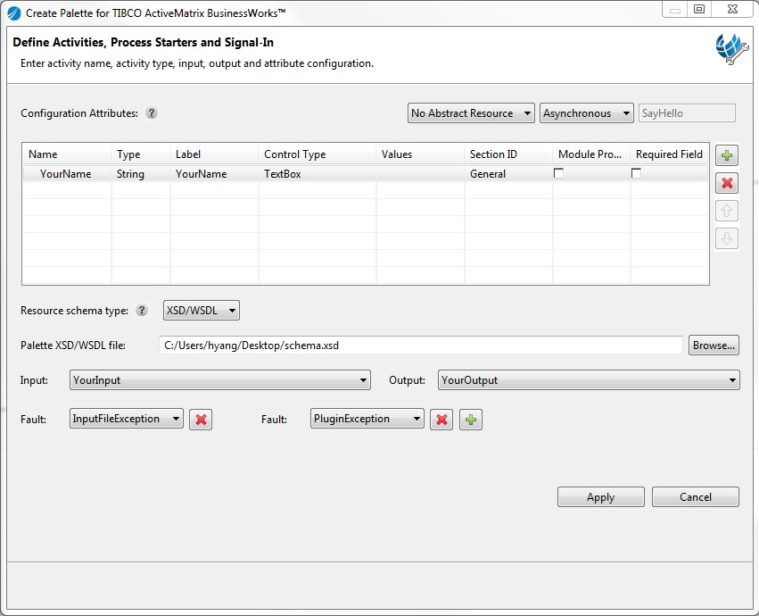 BusinessWorks Plug-in Development Kit can parse the input, output, and fault schema from an XSD or a WSDL file.