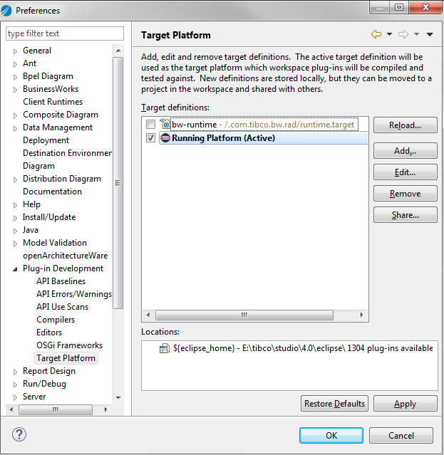 During the development of plug-ins, your plug-in depends on other plug-ins, for example, the SWT and JFace plug-ins. The set of plug-ins that you can use for your development is defined by the plug-ins in your workspace in addition with the plug-ins defined by your target platform.