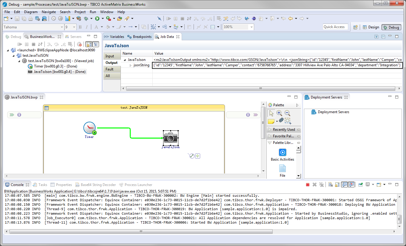 - In the process editor, double-click the JavaToJson activity, enter the following parameters: