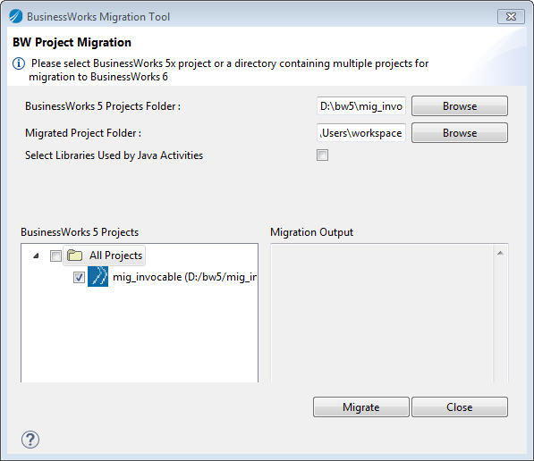 BusinessWorks 5 Projects Folder: the source location of the project to be migrated.Migrated Project Folder: the target location of the migrated projects.