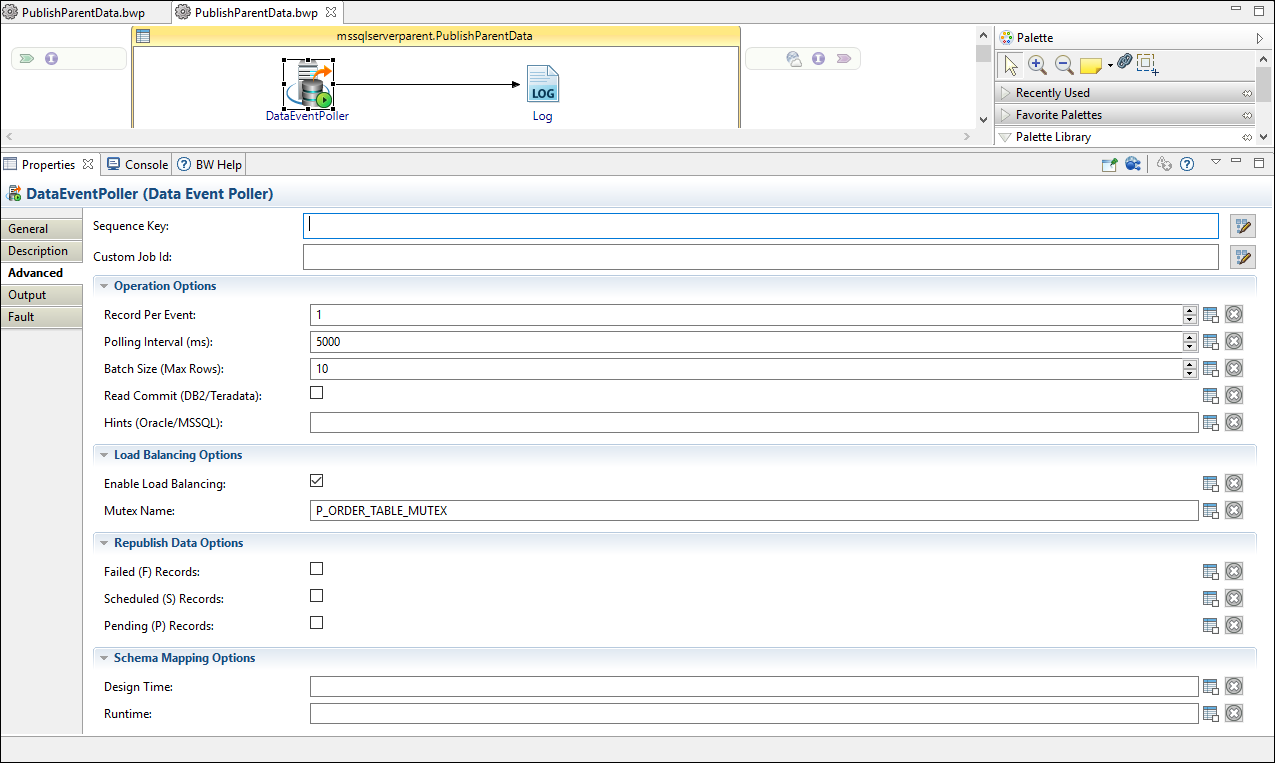 In this example, the DataEventPoller activity polls the data from the publishing table. The following figure shows the PublishParentData process: