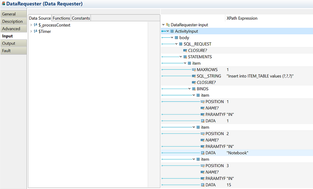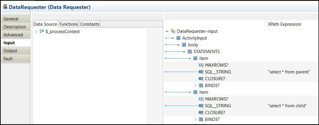 The Data Requester activity allows an application to submit one or more SQL statements, stored procedures, and functions to be processed. The plug-in processes the request and returns the results as a reply.
