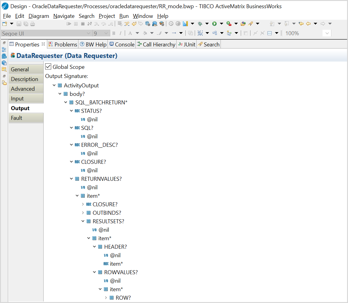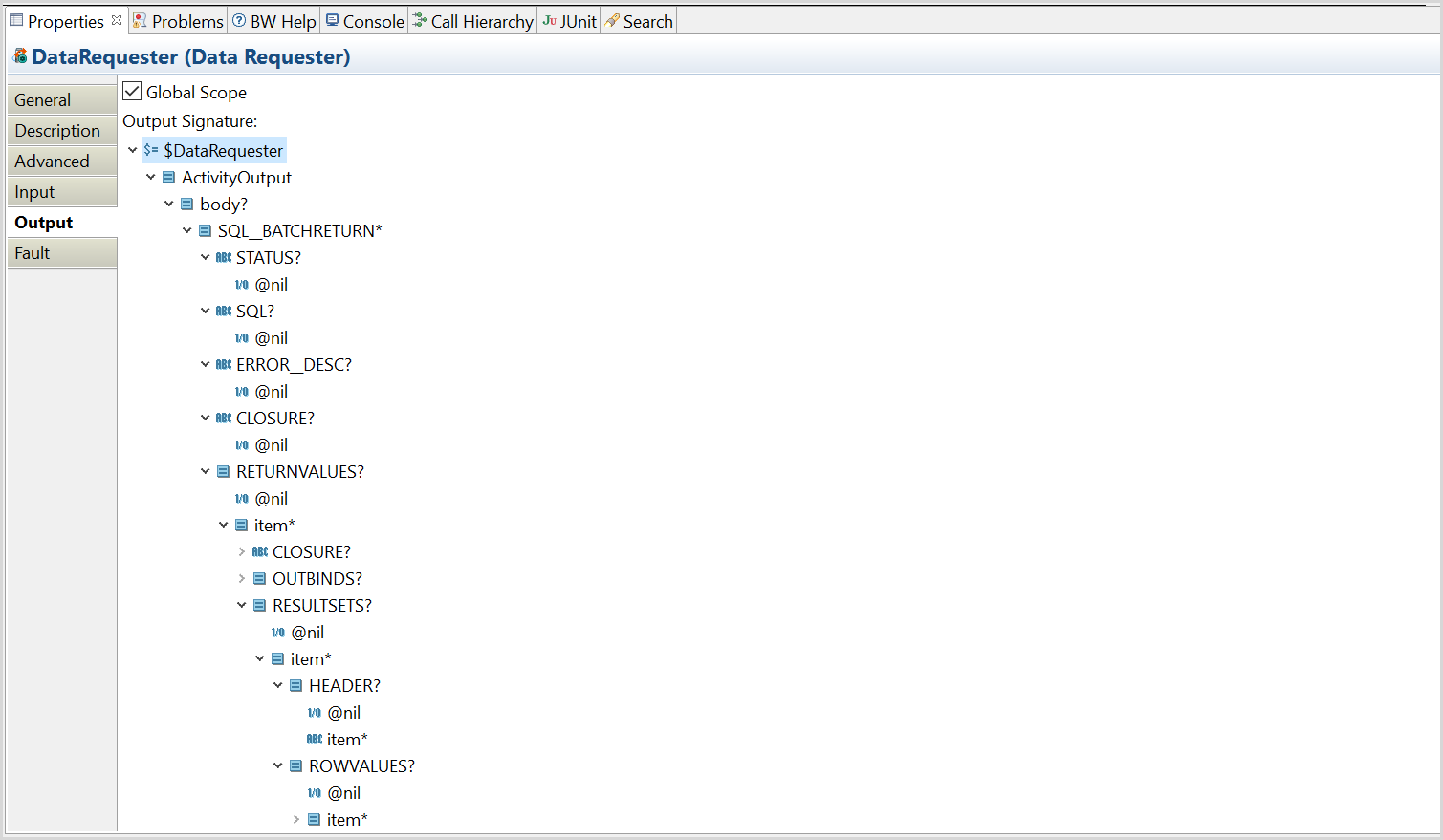 Data Requester Activity: Output Tab with RPC Mode (Operation: SQL_BATCHEXECUTE)