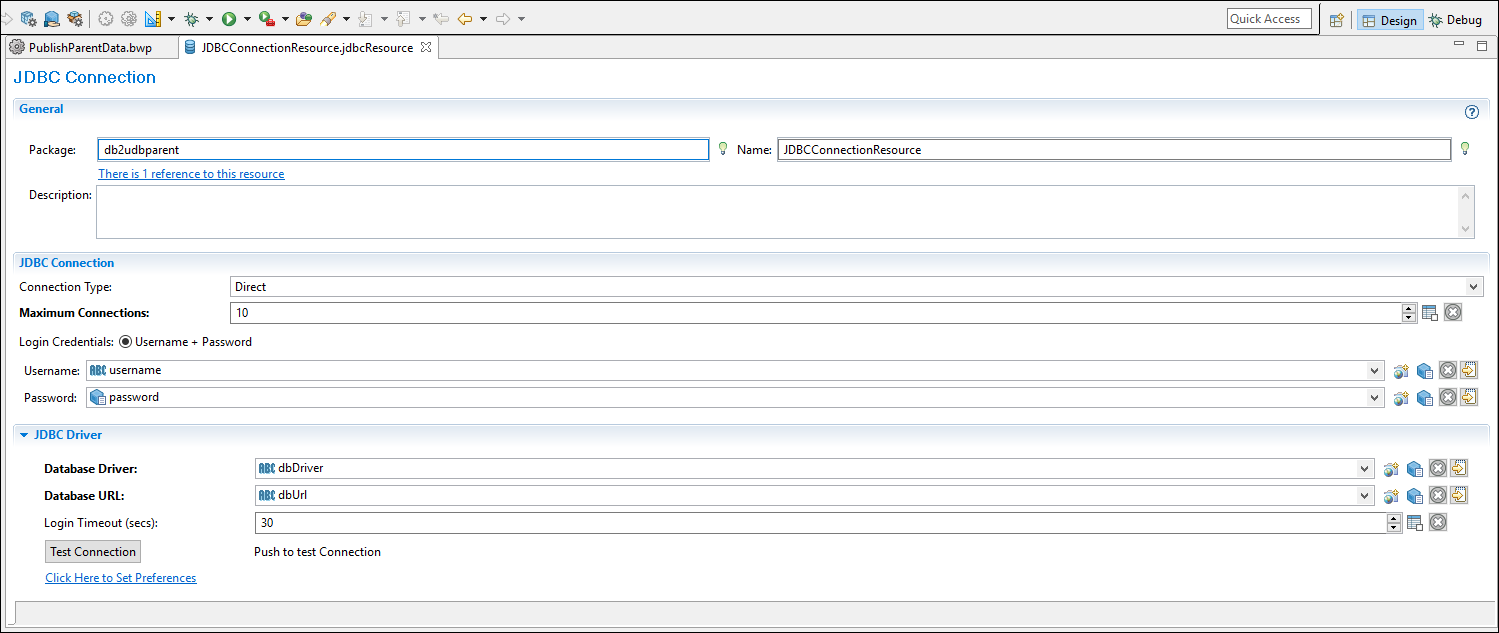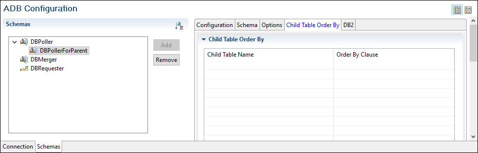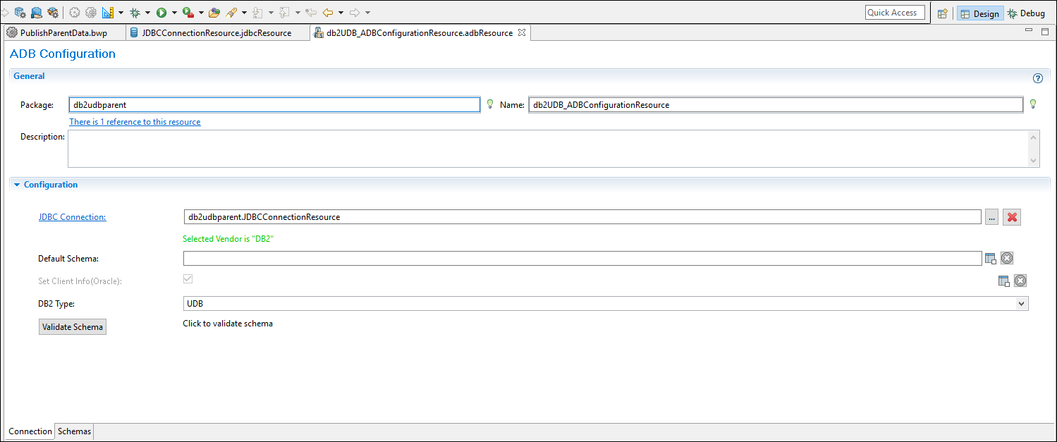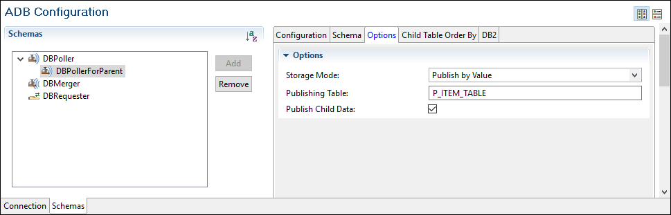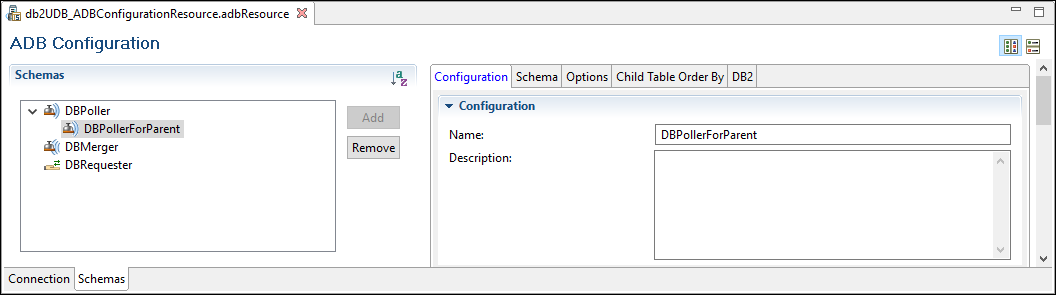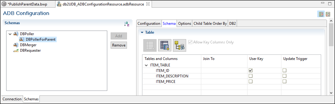 The DB2UDBParent project contains one process: db2udbparent.PublishParentData process. This project demonstrates how the plug-in handles polling of data from a publishing table.