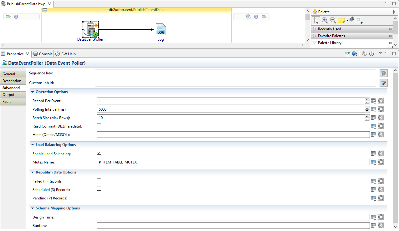 In this example, the DataEventPoller activity polls the data from the publishing table. The following figure shows the PublishParentData process: