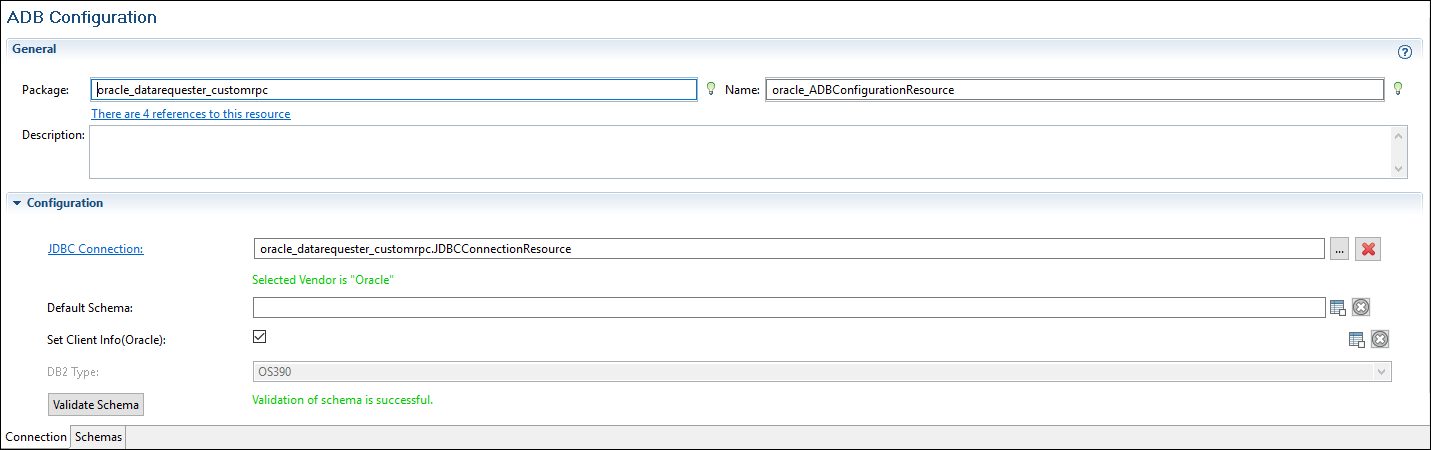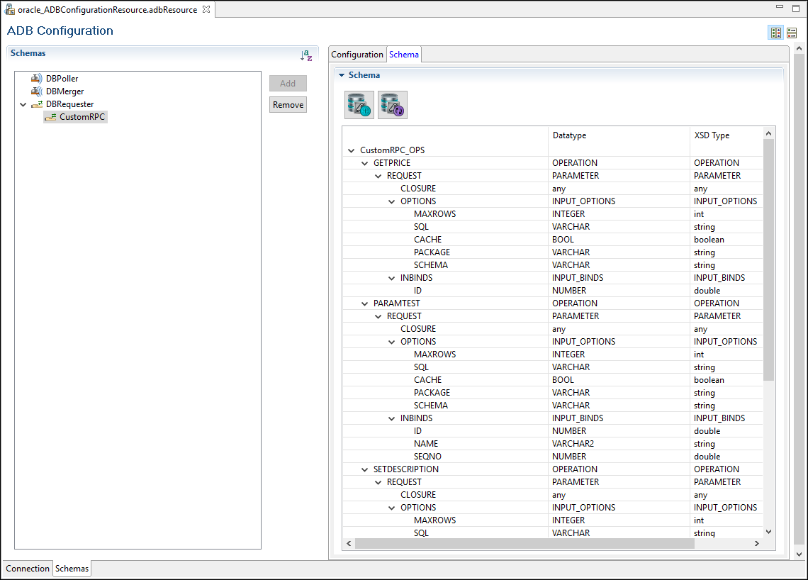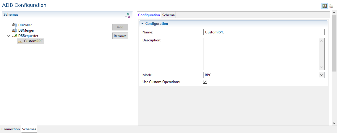 The structure of the selected stored procedure is displayed on the Schema tab. The Configuration tab is used to specify the mode and to select custom operations. In the following figure, RPC mode with custom operations has been selected.