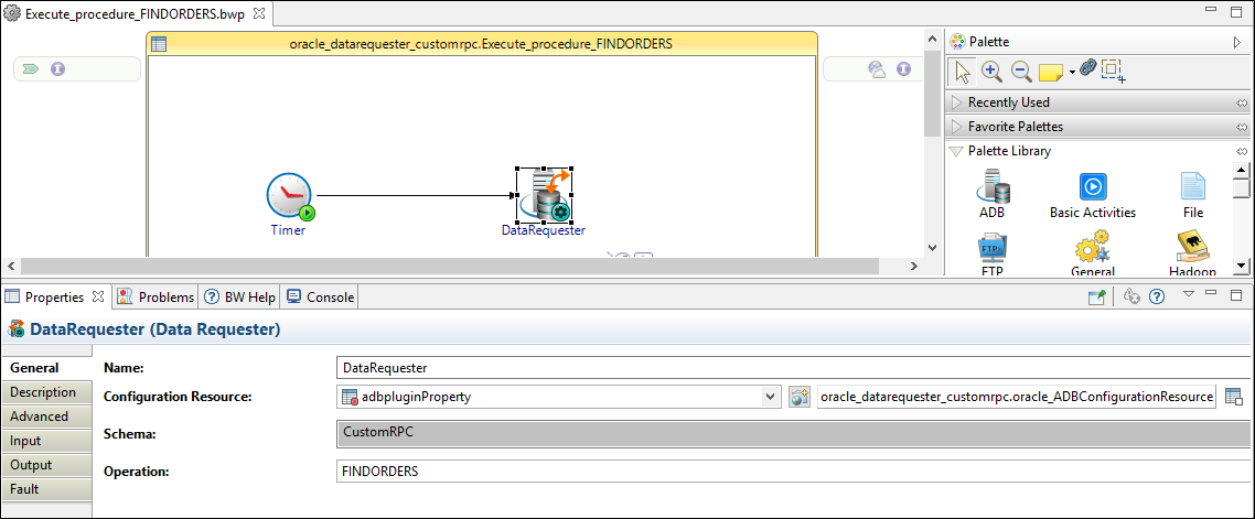 The following figure shows the General tab of the Execute_procedure_FINDORDERS process:
