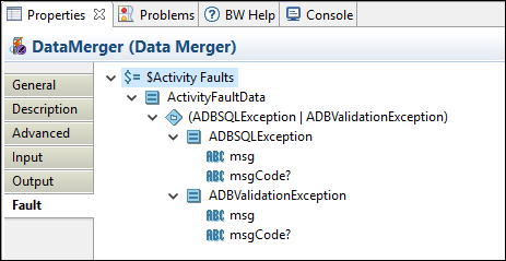 The Fault tab lists exceptions that are thrown by this activity.
