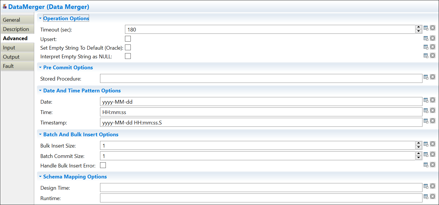 | Stored Procedure | Yes | The value entered here represents the name of a stored procedure the merger calls after the database insert, update, or delete operation and before the commit. |