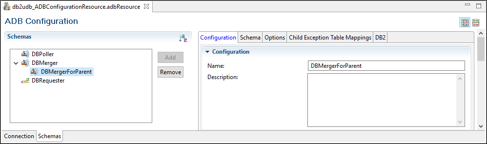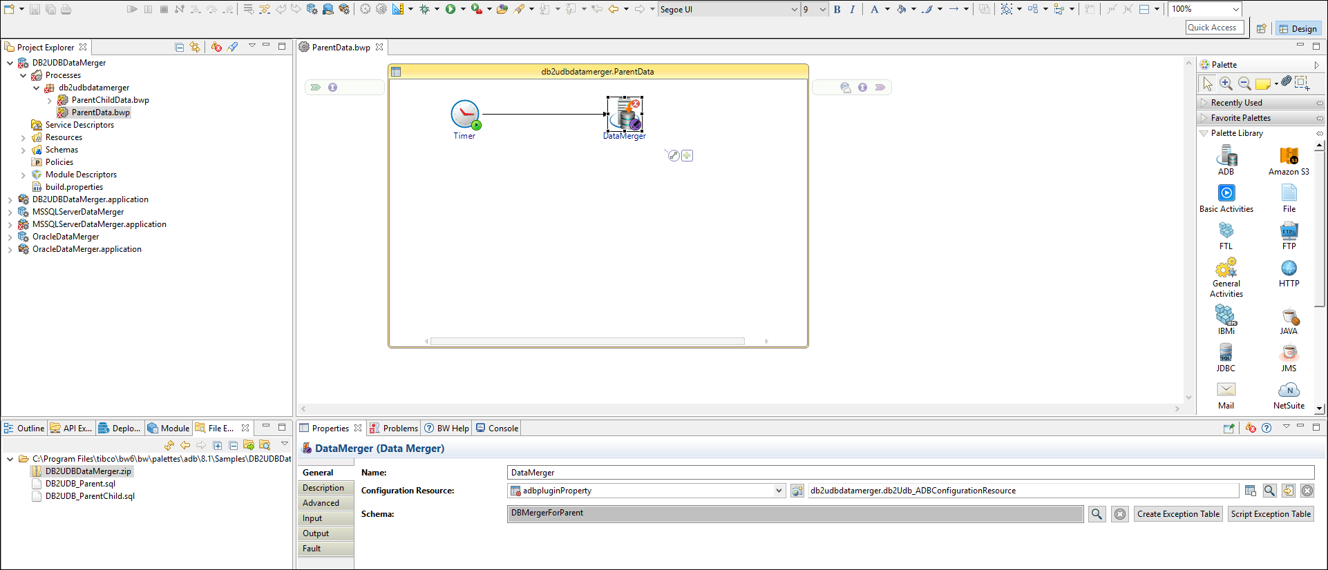 The DB2UDBDataMergerParent project contains one process: db2udbdatamergerparent.ParentData process. This process demonstrates how the plug-in inserts data in the parent table.