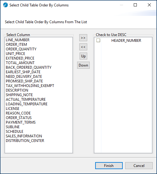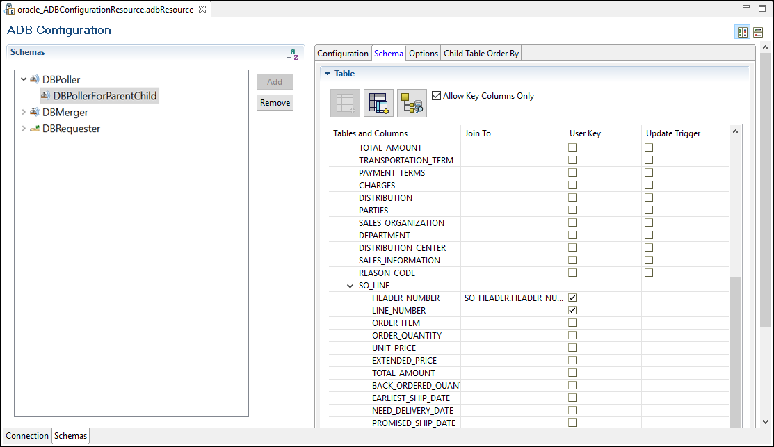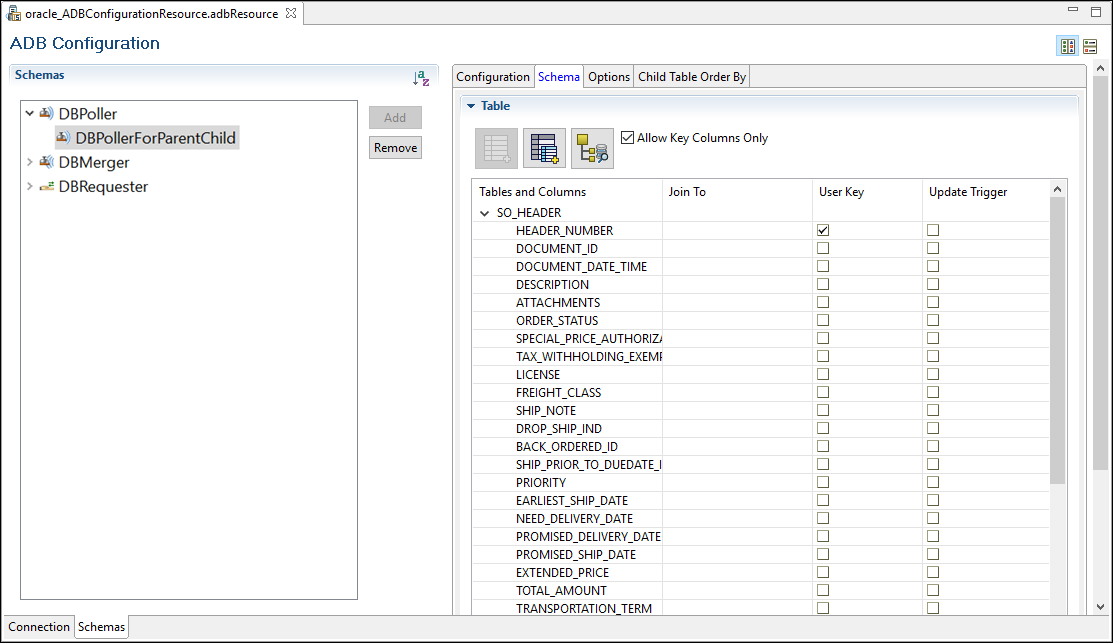 When a child table is added to a parent table, it is displayed on the Child Table Order By tab. You can specify the columns of an Order By clause used for each child table query. The plug-in returns the child table result set in a particular sequence. To specify the columns of an Order By clause for a child table for the DataEventPoller activity and the DataMerger activity: