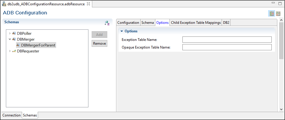 When you use the DB2 connection, the DB2 tab is available on the Schemas page. The DB2 tab contains the following fields for the Data Merger activity: