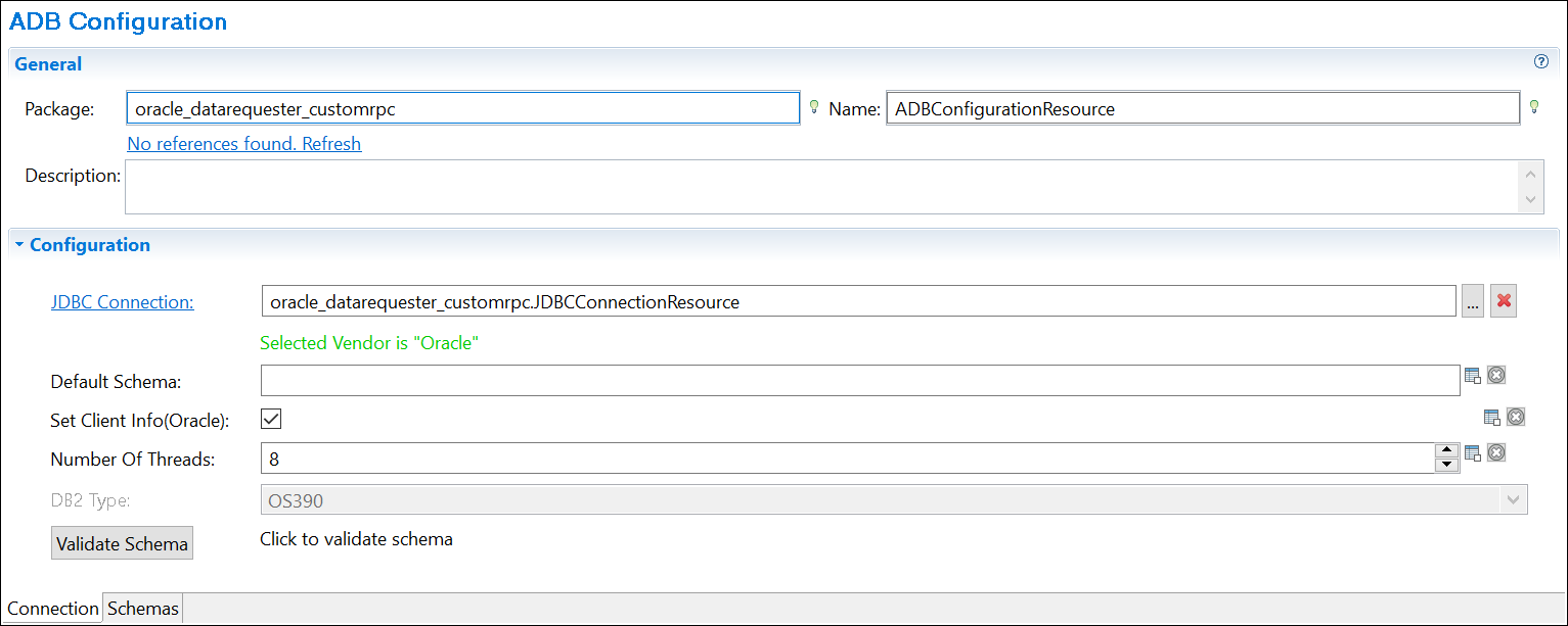 The ADB Configuration shared resource is created. The shared resource consists of two pages: Connection and Schemas.