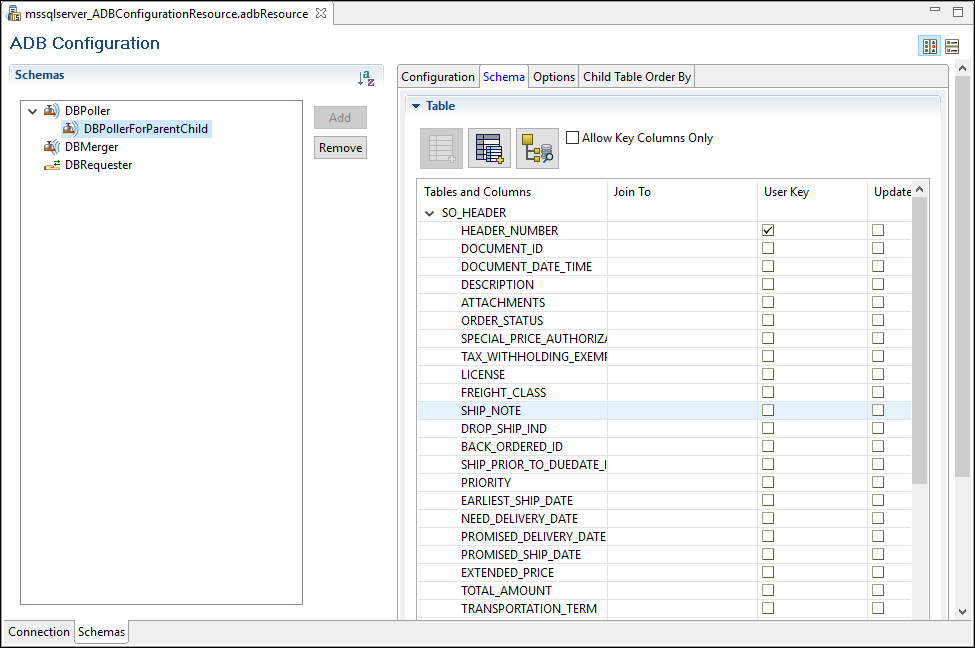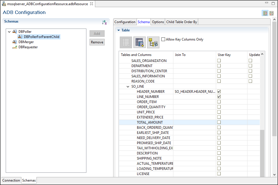 The table schema is defined by using the Schemas tab. The different tabs on the right are shown below.